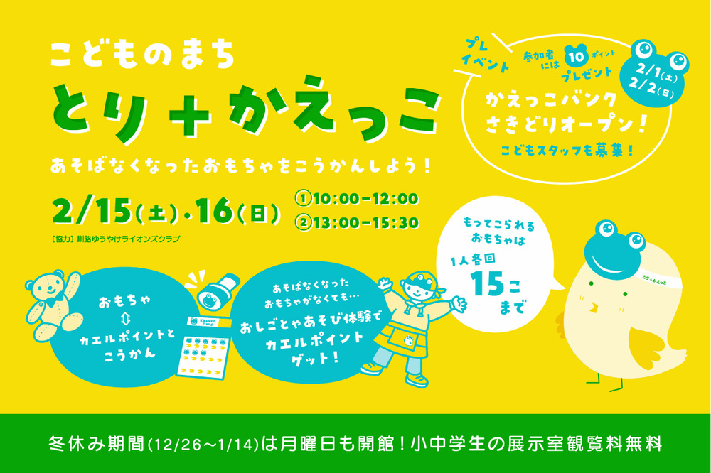 ■2/1(土)・2(日) 13:30~15:30とり+かえっこプレイベント【かえっこバンク さきどりオープン!】つかわなくなったおもちゃを、とり+かえっこで使える「カエルポイント」に先どりでこうかんできる2日間。