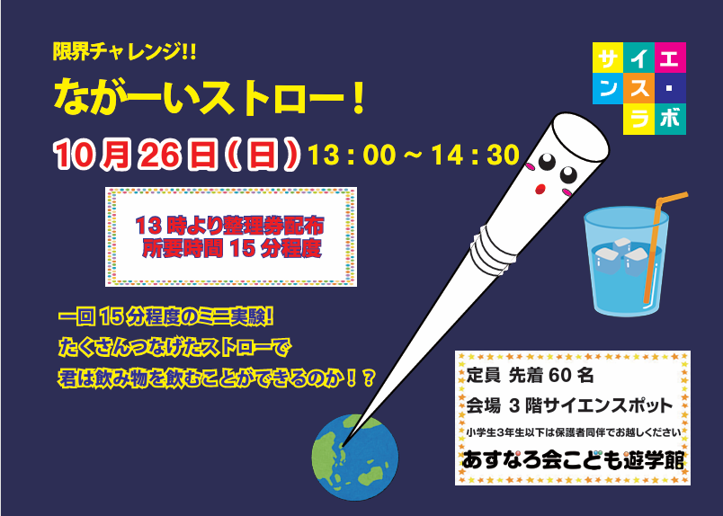 たくさんつなげたストローで君は飲み物を飲めるのか⁉※サイエンスラボは、1回15分程度のミニ実験教室です。日時:10月26日(日) 13:00~14:30 (時間内自由参加) ※13:00より整理券を配布します場所:3階 サイエンスポット定員:60名 整理券がなくなり次第受付終了します 小学3年生以下は保護者同伴でお越しください