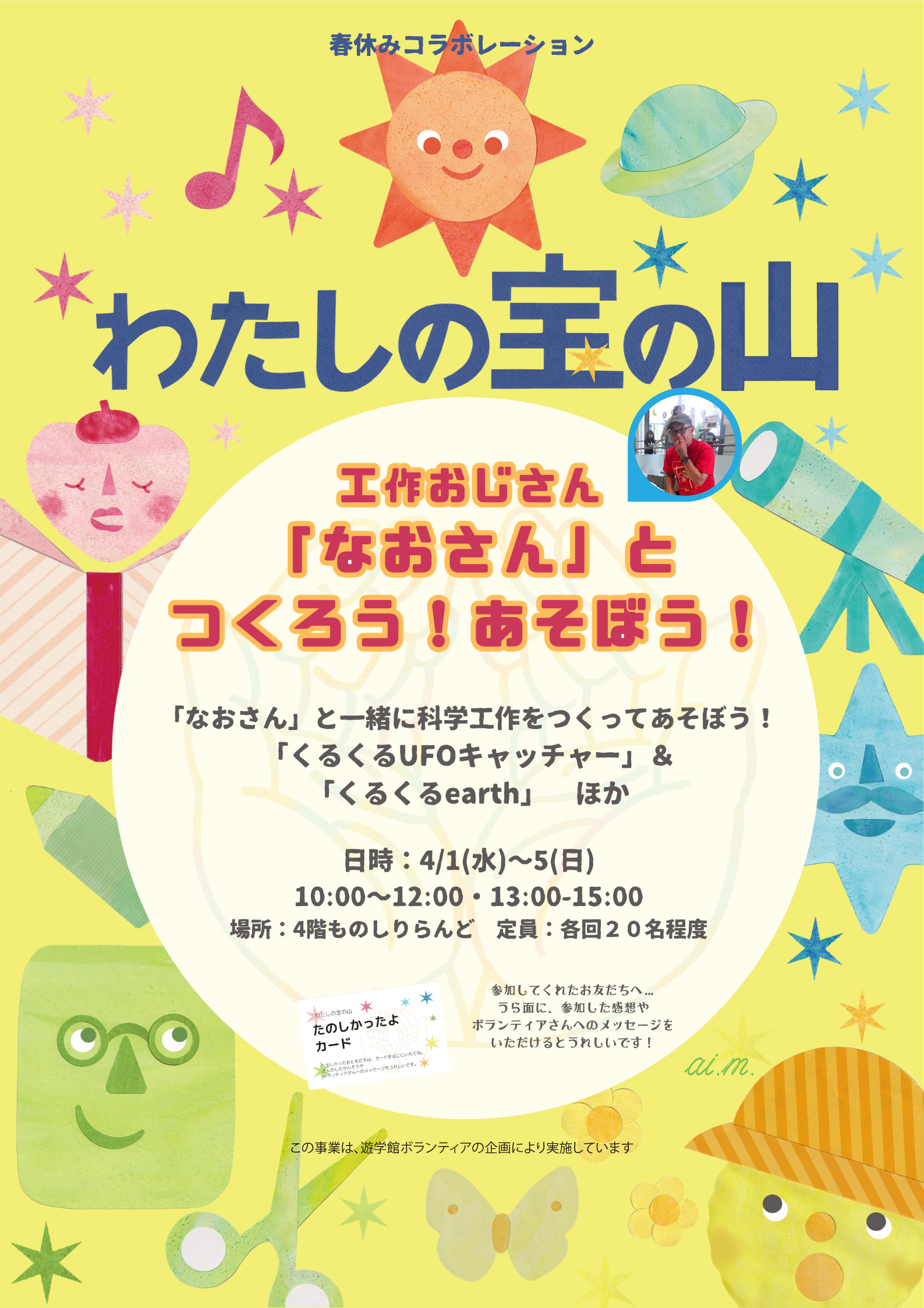 春休みコラボレーション!なおさんと一緒に工作をしてあそぼう!日時:4/1(水)~5(日) 10:00~12:00・13:00~15:00場所:4階ものしりらんど定員:各回20名程度この事業は、遊学館ボランティアの企画により実施しています。