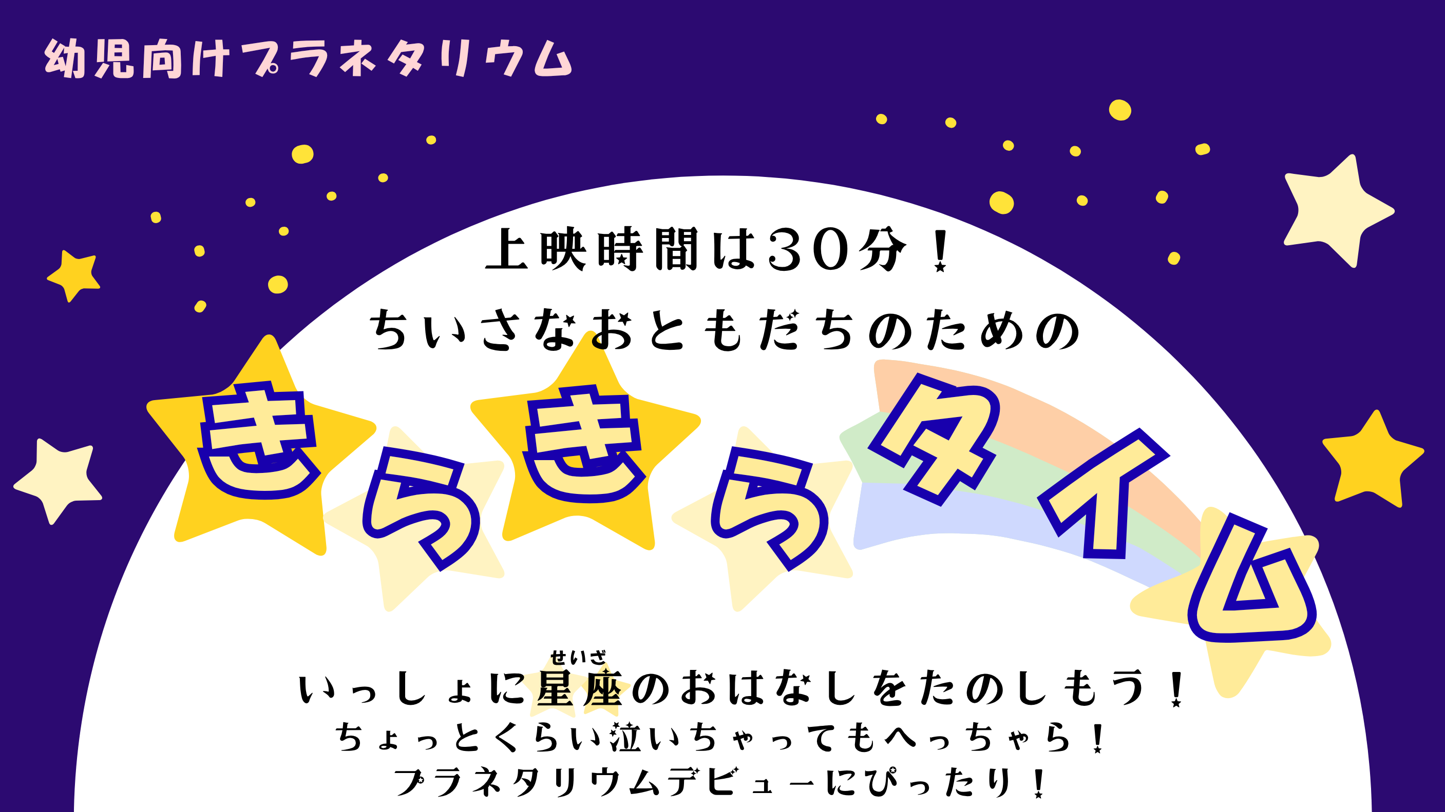 キラキラお星さまと星座にまつわるゆかいなお話で、お子様のプラネタリウムデビューを応援します♪ 30分間のお気軽番組です。