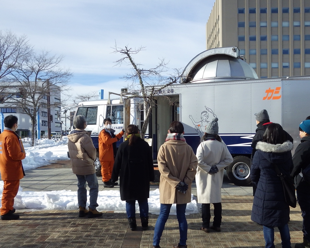 先日、天文指導員ボランティア向けの研修を行いました。今回は、移動天文車「カシオペヤ号」の設置や操作方法などで、天文車に搭載されている大型望遠鏡の操作方法などを学びました。また、小型望遠鏡と投影板を使用した太陽観測の方法も併せて学びました。今後、遊学館や各地で行われる観測会に出向き、地域のみなさんと一緒に楽しく学べるよう勉強をしています。これからの天文指導員の活躍が楽しみです!