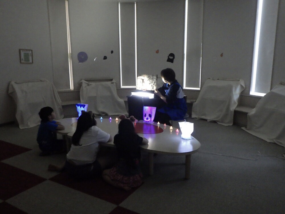 毎年、夏休みのお盆近くのおはなし会は「こわ~いおはなし会」です。ちょっと暗い雰囲気で、ちょっとこわい絵本をボランティアさんが読んでくれます☆小学生には大人気、小さい子は泣いて出て行っちゃうという、いつもと違ったおはなし会も、遊学館らしいイベントです。