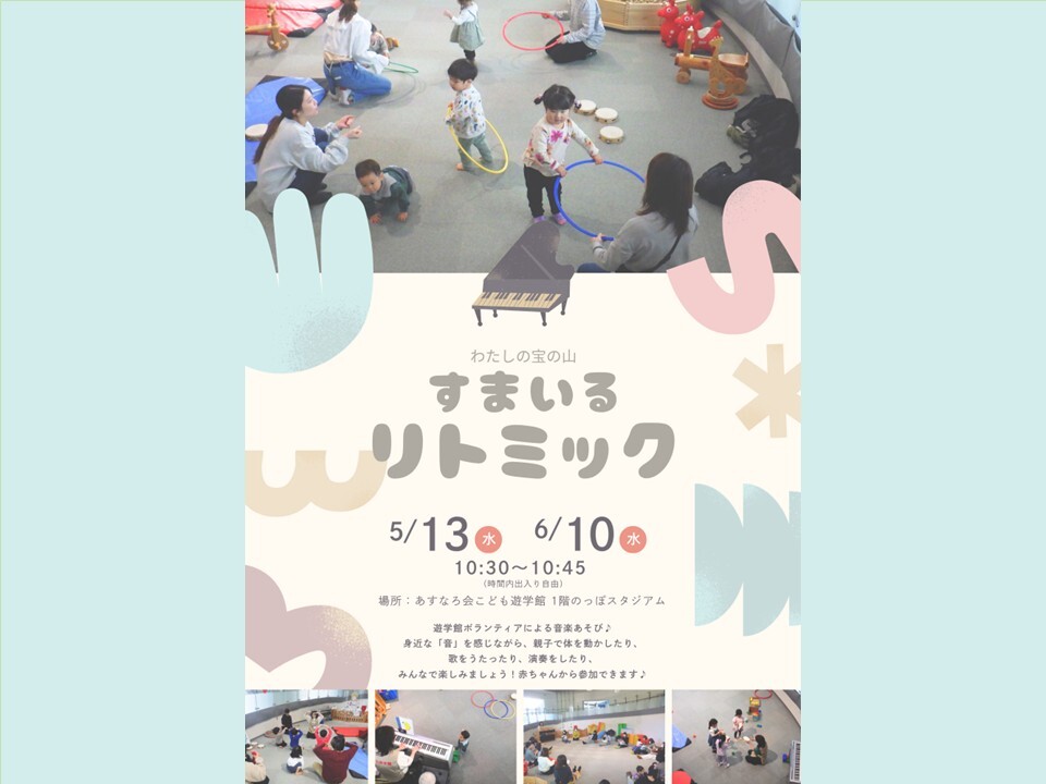 日時:5/13(水)・6/10(水) 10:30~10:45場所:1階のっぽスタジアム(時間内出入り自由)身近な『音』を感じながら、親子で体を動かしたり♪歌をうたったり♪演奏をしたり♪みんなで楽しみましょう!※「わたしの宝の山」は遊学館ボランティアの企画により実施する事業です。