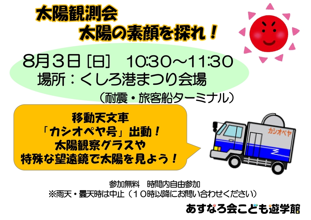 【天候不良のため中止】8/3(日) 太陽観測会「太陽の素顔を探れ!」