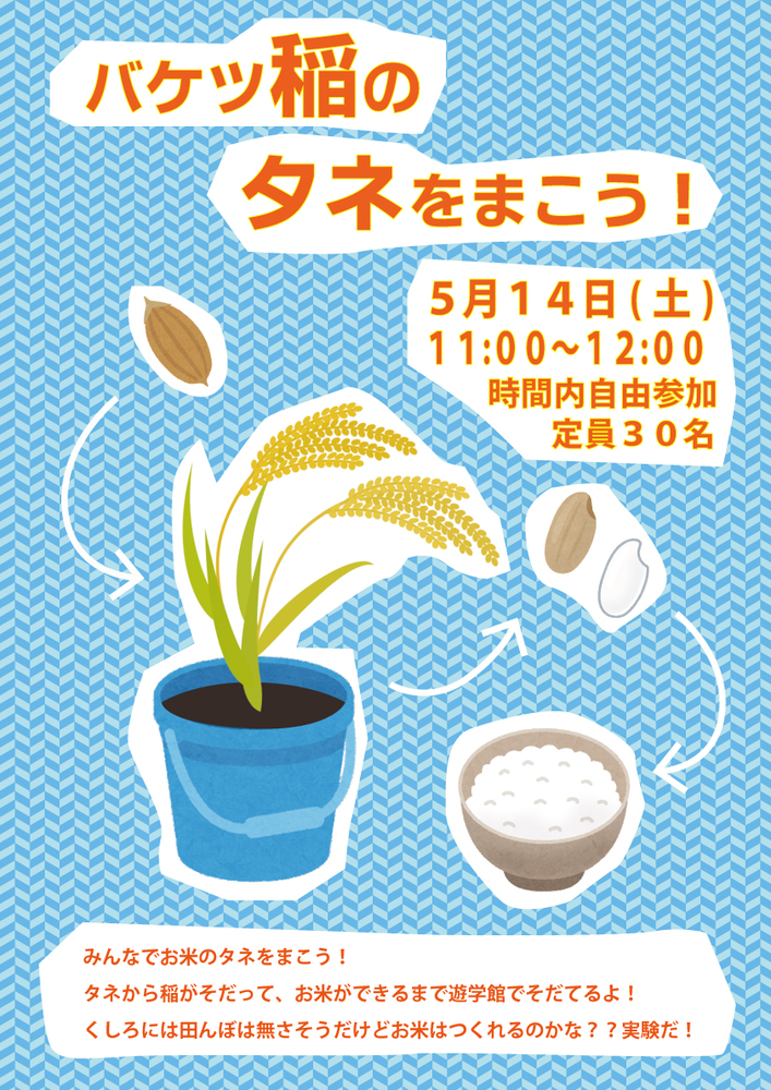 くしろでもお米はできるのか?みんなで稲のタネをまいて確かめよう!お米が収穫できるまで稲は遊学館でそだてるよ。日 時:5月14日(土) 11:00~12:00(時間内自由参加)定 員:30名参加費:無料提 供:JAグループ バケツ稲づくり事務局