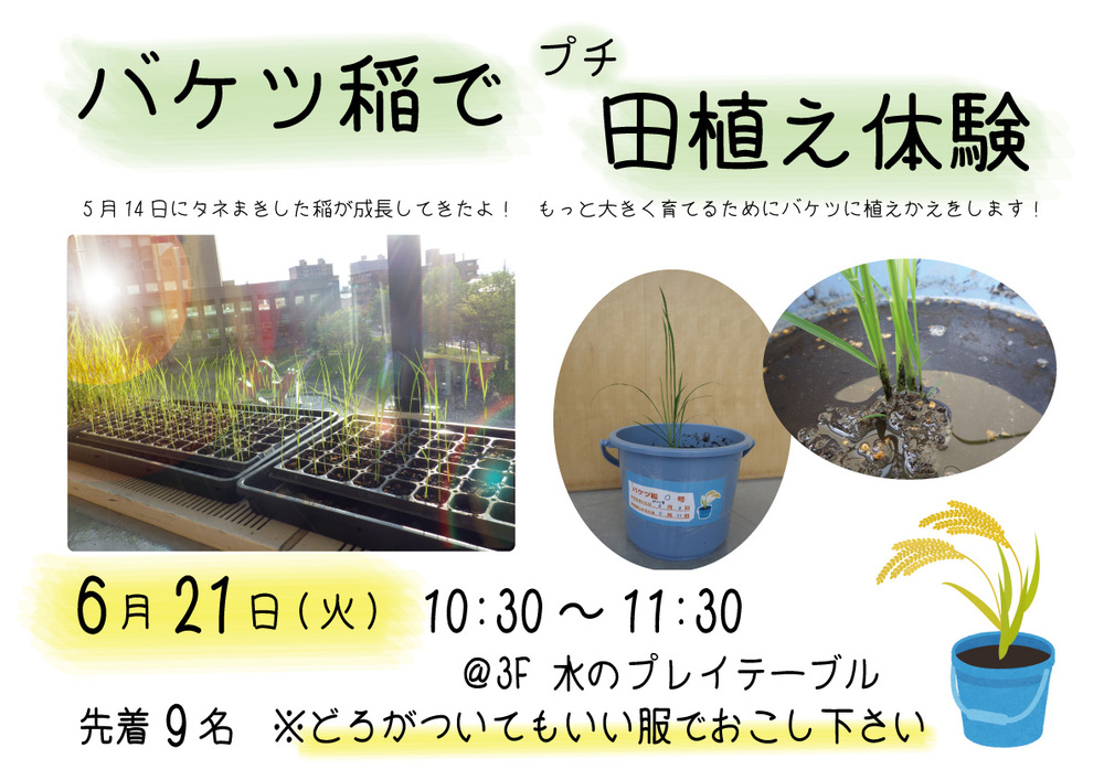 5月14日にタネをまいた稲の苗が大きくなりました♪より大きく育てるためにバケツに植えかえます!参加ご希望の方は泥がついてもいい服装でお越しください。日 時:6月21日(火) 10:30~11:30(時間内自由参加)定 員:9組場 所:3階 水のプレイテーブル