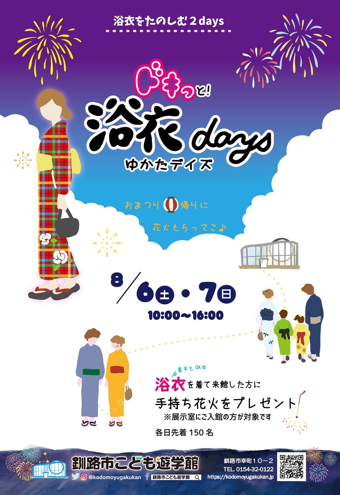 浴衣(ゆかた)や甚平を着て遊学館に遊びに来てね!ドキドキわくわくな夏の思い出に、花火をプレゼント♪ ※展示室へご入館された方が対象です日 時:8/6(土)・7(日) 10:00~16:00場 所:こども遊学館展示室内定 員:各日 先着150名参加費:無料 ※展示室観覧料が必要です