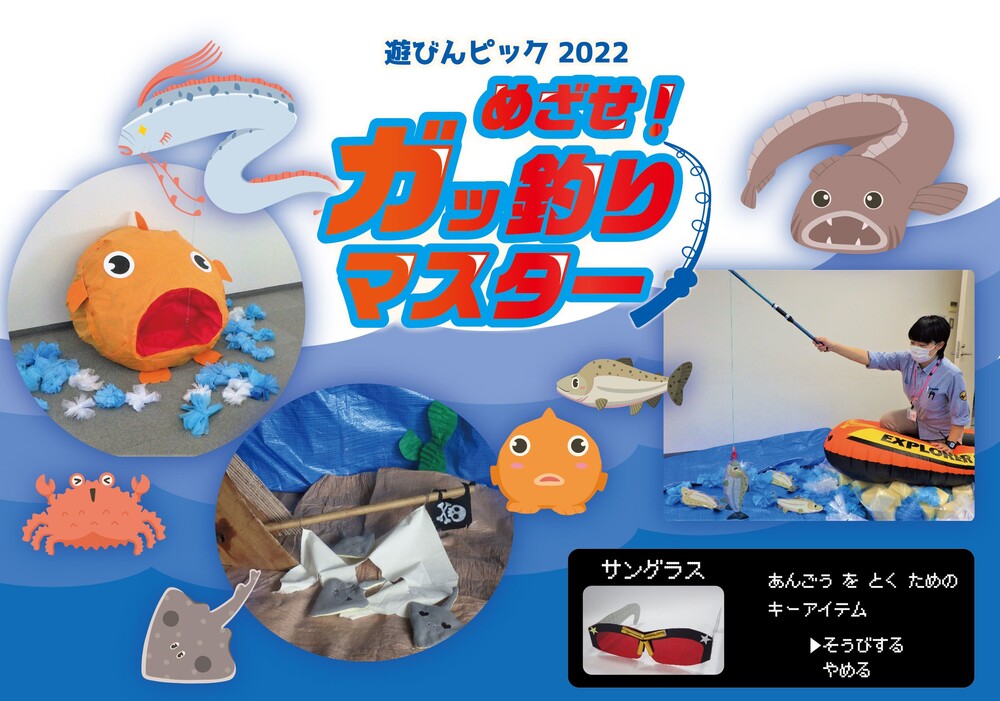 10月8日(土)・9日(日)・10日(月・祝)の3連休は年に1度の大イベント「遊びんピック2022」に集合だ!!今年のテーマは、『めざせ!ガッ釣りマスター』”釣りスキル”をみがくミッションをクリアして、レア魚「リュウグウノツカイ」を釣り上げるゲームに挑戦!君はガッ釣りマスターになれるかな?!■イベント開催時間■各日 10:00~16:00(受付は15:00に終了)