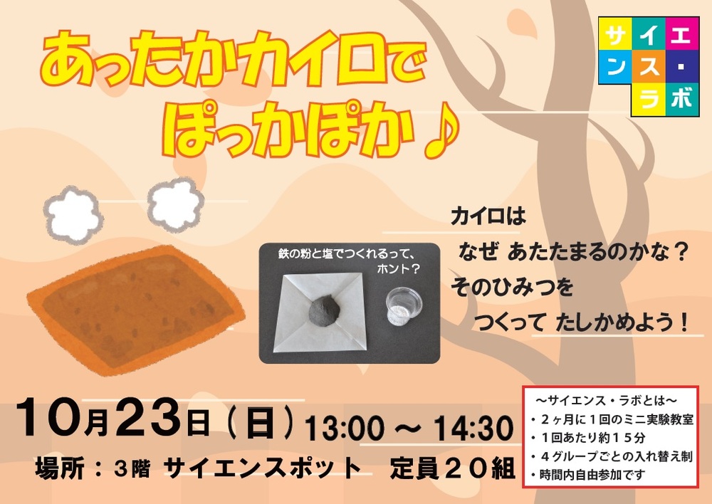 カイロはなぜあたたまるのかな? そのひみつを、つくってたしかめよう!※サイエンスラボは、約15分ごとのミニ実験教室です。日時:10月23日(日) 13:00~14:30 ※時間内自由参加場所:3階 サイエンスポット定員:先着 20組(4グループごとの入れ替え制) ※5分前より整理券を配布します ※当日のサイエンステーブル・ワークショップはお休みします