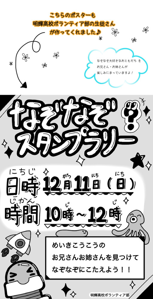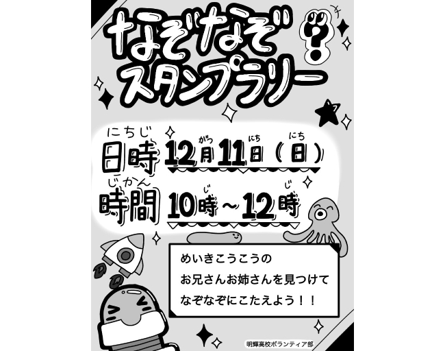 遊学館の中にいる高校生のお兄さん、お姉さんを探してなぞなぞに挑戦し、スタンプをもらおう!スタンプを全部集めたら、ステキなプレゼントがもらえるかも?!(先着50名様)日時:12月11日(日) 10:00~12:00(時間内自由参加)場所:遊学館館内参加費:無料(要展示室観覧料)講師:遊学館サポーターズ(釧路明輝高校ボランティア部)