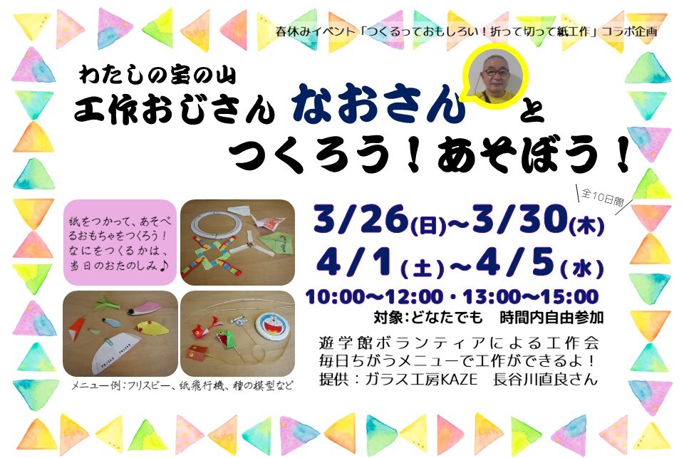 春休みイベントコラボ企画★紙を使った工作ができるよ!なおさんが毎日違うメニューで提供する10日間!!工作メニューはコチラでチェック!日時:3月26日(日)~30日(木)・4月1日~5日(水) 10:00~12:00・13:00~15:00(時間内自由参加)場所:3階ふしぎらんど特設会場対象:どなたでも参加費:無料(要展示室観覧料)講師:遊学館ボランティア「なおさん」※「わたしの宝の山」は遊学館ボランティアの企画により実施する事業です。