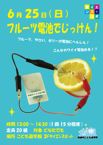 フルーツ、やさい、ゼリーが電池にへんしん!自由研究のヒントにも!?※サイエンスラボは、1回15分程度のミニ実験教室です。日時:6月25日(日) 13:00~14:30 ※時間内自由参加場所:3階 サイエンスポット定員:先着 20組(4グループごとの入れ替え制) ※13:00より整理券を配布します