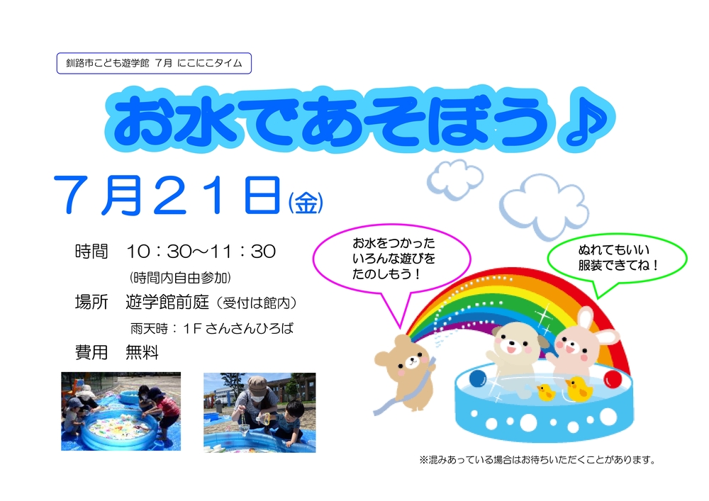 お水を使ったいろんな遊びを楽しんじゃおう♪濡れたり汚れても大丈夫な服で来てね。日 時:7月21日(金) 10:30~11:30(時間内自由参加)場 所:遊学館前庭(合庁側入り口横) ※天候により、さんさんひろばで行う場合があります参加費:無料 ※混みあっている場合はお待ちいただくことがあります。