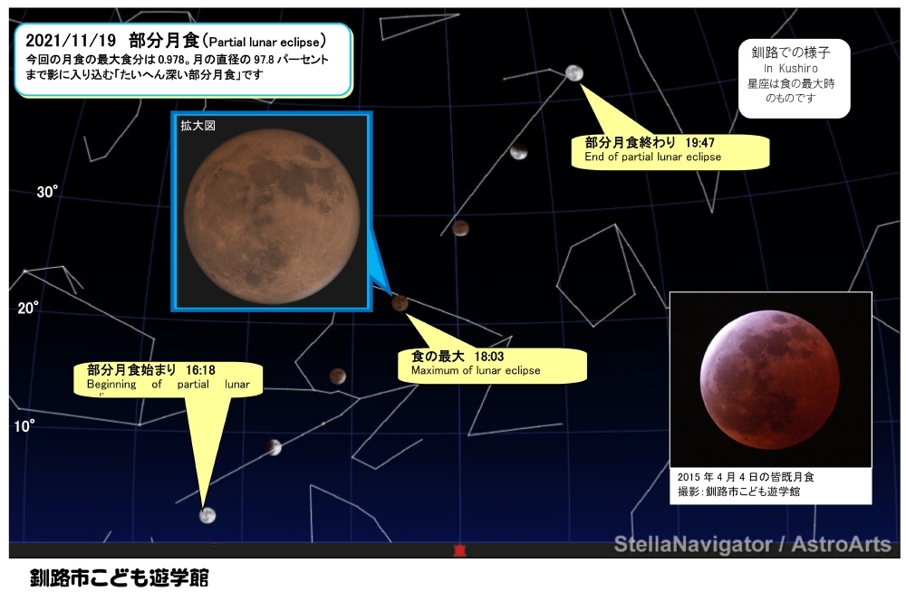 食の最大は18:02。今回は月の直径の97.8パーセントまで影に入り込む、たいへん「深い」部分月食です。===悪天候のため中止===日時:11月19日(金) 17:30~19:00(雨天・曇天は中止)会場:遊学館 前庭費用:無料