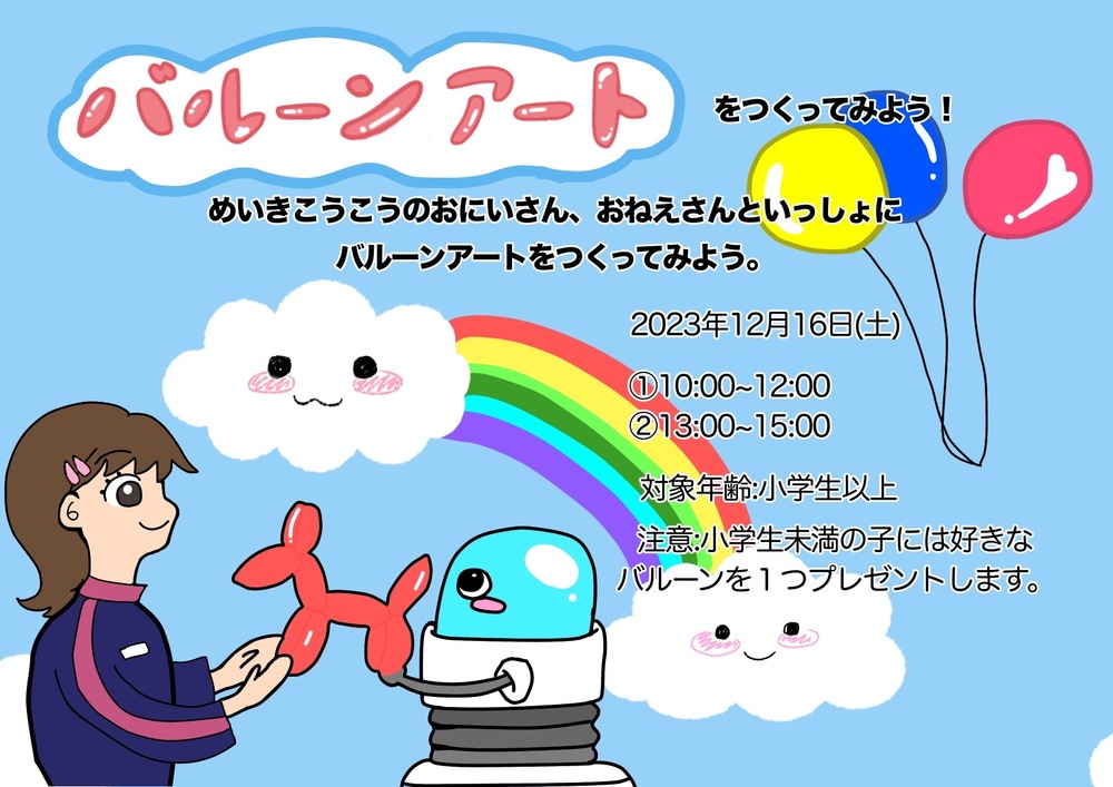 明輝高校のお兄さん、お姉さんと一緒にバルーンアートをつくってみよう!小さなお友達にはバルーンをプレゼントするよ♪(各回材料がなくなり次第終了)日時:12月16日(土) ①10:00~12:00 ②13:00-15:00(時間内自由参加)場所:1階のっぽスタジアム参加費:無料(要展示室観覧料)講師:遊学館サポーターズ(釧路明輝高校ボランティア部)