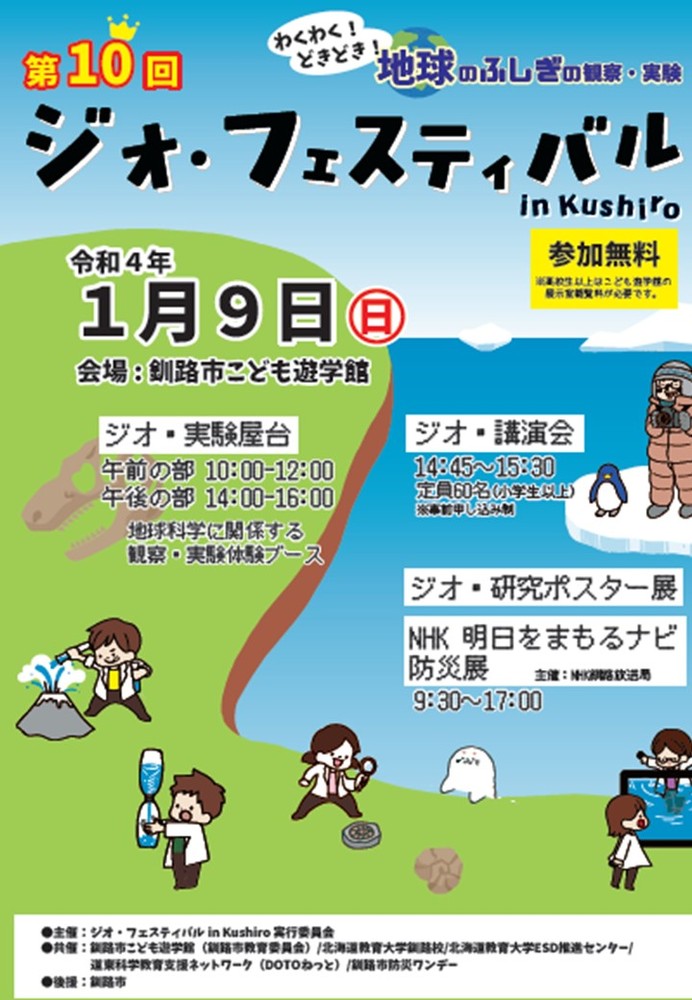地球を科学しちゃうお祭りだ~!実験や工作の屋台が大集合!地球科学の楽しさを体験しよう!【主催】ジオ・フェスティバル in Kushiro 実行委員会日時:1月9日(日) 9:30~17:00ジオ・実験屋台 10:00~12:00・14:00~16:00