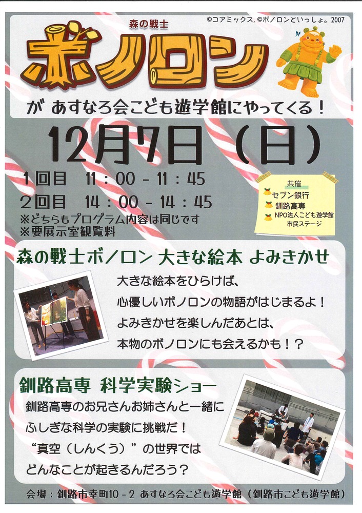 全国のセブン-イレブン等で無料配布している『森の戦士ボノロン』の大きな絵本おはなし会と釧路高専の学生による科学実験ショー!【共催】株式会社セブン銀行・釧路工業高等専門学校日 時:12月7日(日)①11:00~11:45 ②14:00~14:45会 場:1階 のっぽスタジアム参加費:無料(要展示室観覧料)