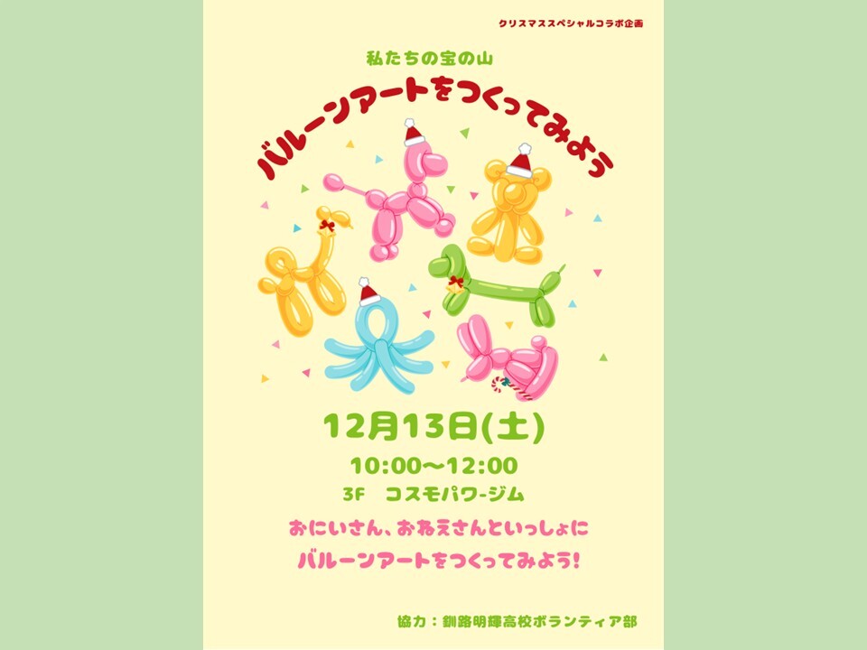 明輝高校のお兄さん、お姉さんと一緒にバルーンアートをつくってみよう!小さなお友達にはバルーンをプレゼントするよ♪(各回材料がなくなり次第終了)日時:12月13日(土) ①10:00~12:00(時間内自由参加)場所:3階コスモパワージム参加費:無料(要展示室観覧料)講師:遊学館サポーターズ 釧路明輝高校ボランティア部
