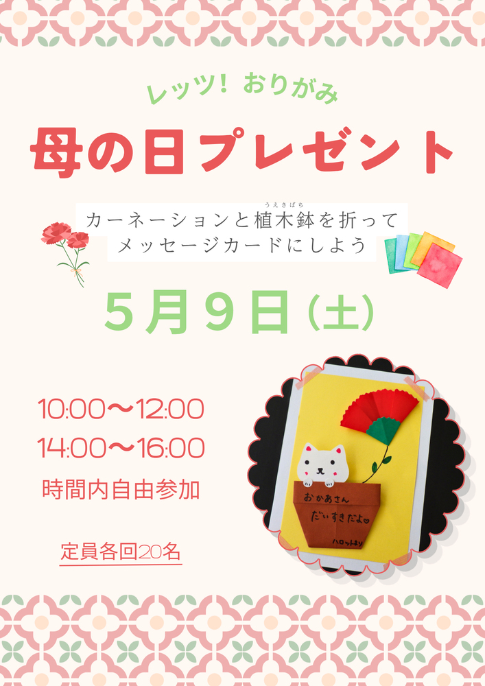 折り紙でカーネーションと植木鉢をおってネコちゃんをそえたら、かわいいメッセージカードのできあがり♪大切な人へのプレゼントにどうぞ。大人の方の参加も大歓迎です!日 時:5月9日(土) 10:00~12:00/14:00~16:00(時間内自由参加)定 員:各回20名場 所:1階 あそびらんど