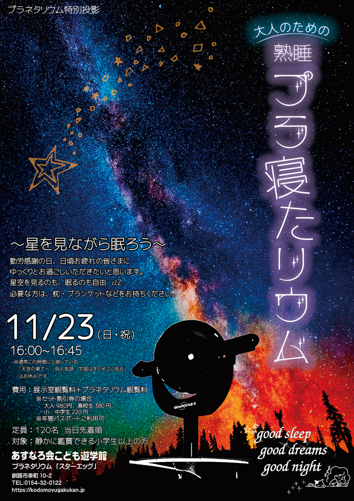 11/23(日・祝)【プラネタリウム特別投影】大人のための『熟睡』プラ寝たリウム