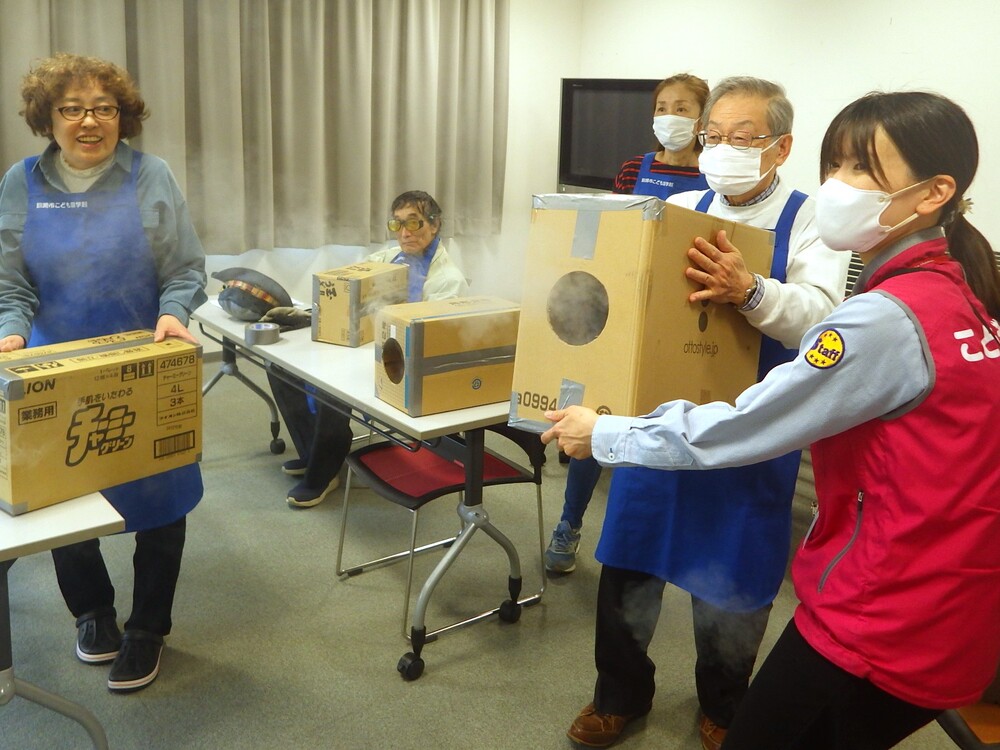 5/24に開催する「ファンクラブ教室 空気砲サバイバルゲーム」の事前研修。遊学館では、サイエンスショーやワークショップで登場する空気砲ですが、こどもたちが空気砲を撃ち合うゲームタイプは初めて。ボランティアさんには、こども役になってもらい実際にできるか実験してもらいました。段ボールの大きさなどによって空気の出方も変わります。本番はどんな教室になるか楽しみですね♪