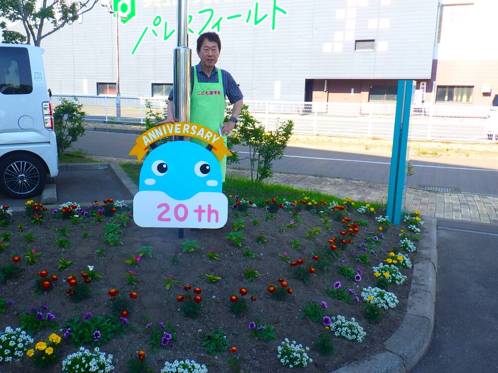 今年は、遊学館20周年ということでボランティアさんに記念看板を作っていただき、花壇に設置しました。当館のウェルカムロボット「ハロット」がモチーフでとっても可愛い看板です。これから花壇のお花が満開になったら、さらに看板が目立っていくのが楽しみです♪