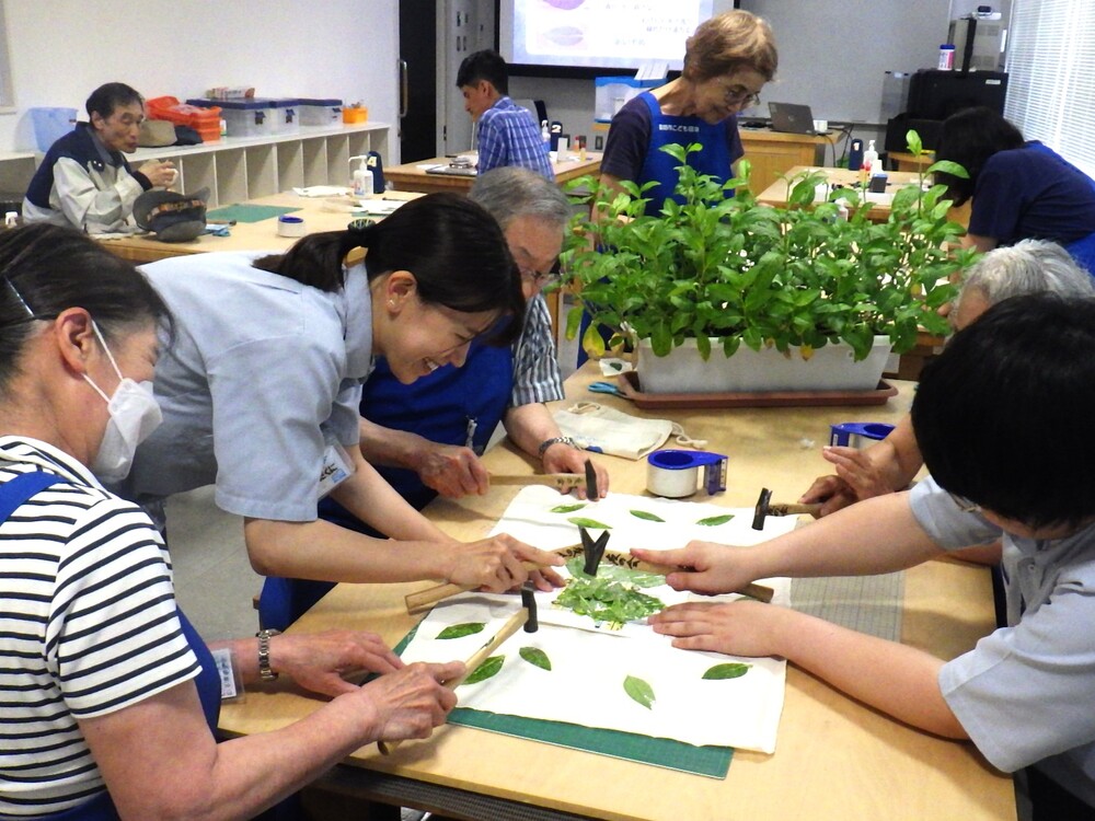 昨年に引き続き、館内で育てた「タデアイ」つかって、藍葉のたたき染を体験しました。キレイにたた染めするには、根気よく、まんべんなく、叩くのが大切と教わったので、皆さん真剣に「ドンドン」と金づちで叩いています。スタッフも参戦して、ちょっとしたデザイン完成を目指しています。