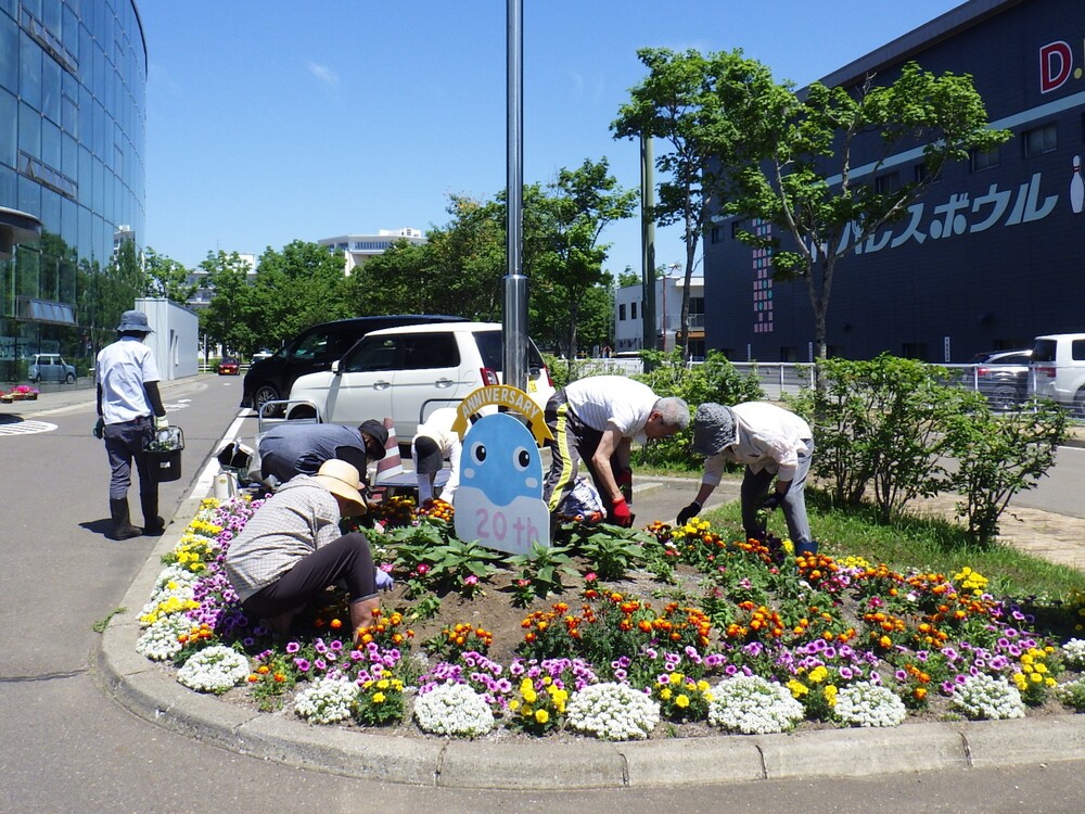 暖かい日が続き、花壇も色づいてきました。この日は、花壇の雑草抜きや追肥を行いました。20周年記念看板のハロットもお花に囲まれ良い感じになってきました♪
