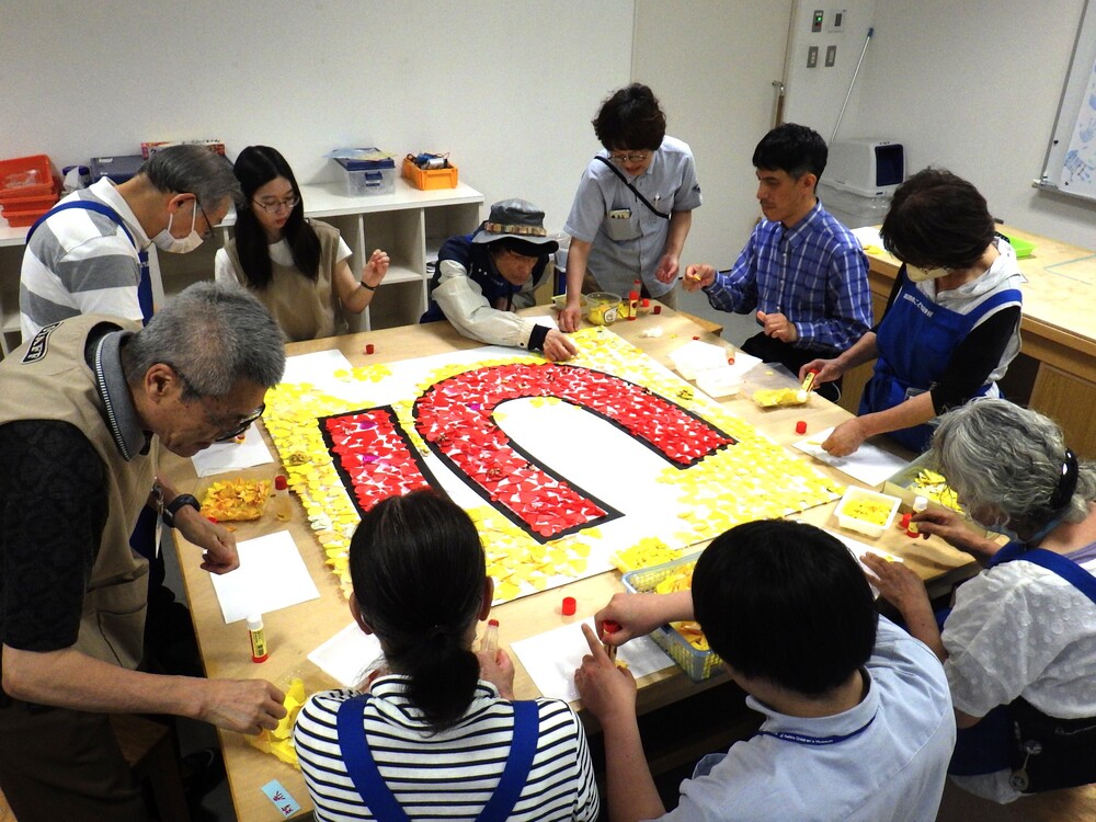 7/26に開催する「みんなでお祝い!20周年セレモニー」でお披露目する垂れ幕をみんなで作りました。皆さんが貼っているのは、折り紙でつくった「ハート」です。たくさんのボランティアさんやサポーターズの皆さんが、遊学館やご自宅でたっくさん作って出さり提供してくれました。遊学館ボランティアみんなの想いをのせて、台紙に貼っていきます。ボランティアチームは「う」の文字。地域の幼保園や小中高大学生が他の文字を作成してくれています。